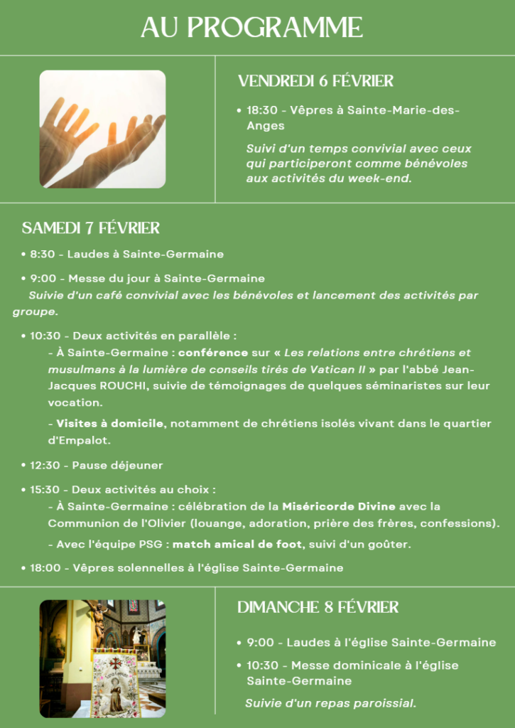 Voici le programme : n’hésitez pas à passer un temps, une activité avec eux, ou bien même tout le week-end pour les rencontrer, évangéliser, apprendre à évangéliser, vous former, prier etc.
